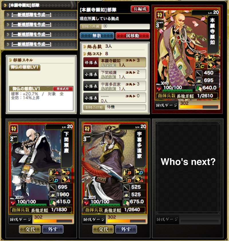 本願寺さん・下間さん・宇喜多さんはいますが、もう一人は誰にするか?