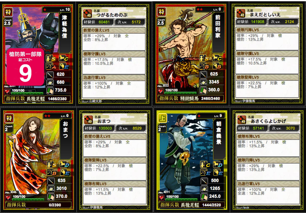 とりあえずスキルは堅陣・布陣・守護で手軽に。あとはランクアップして育成していきます。やっぱり朝倉さん強いです。